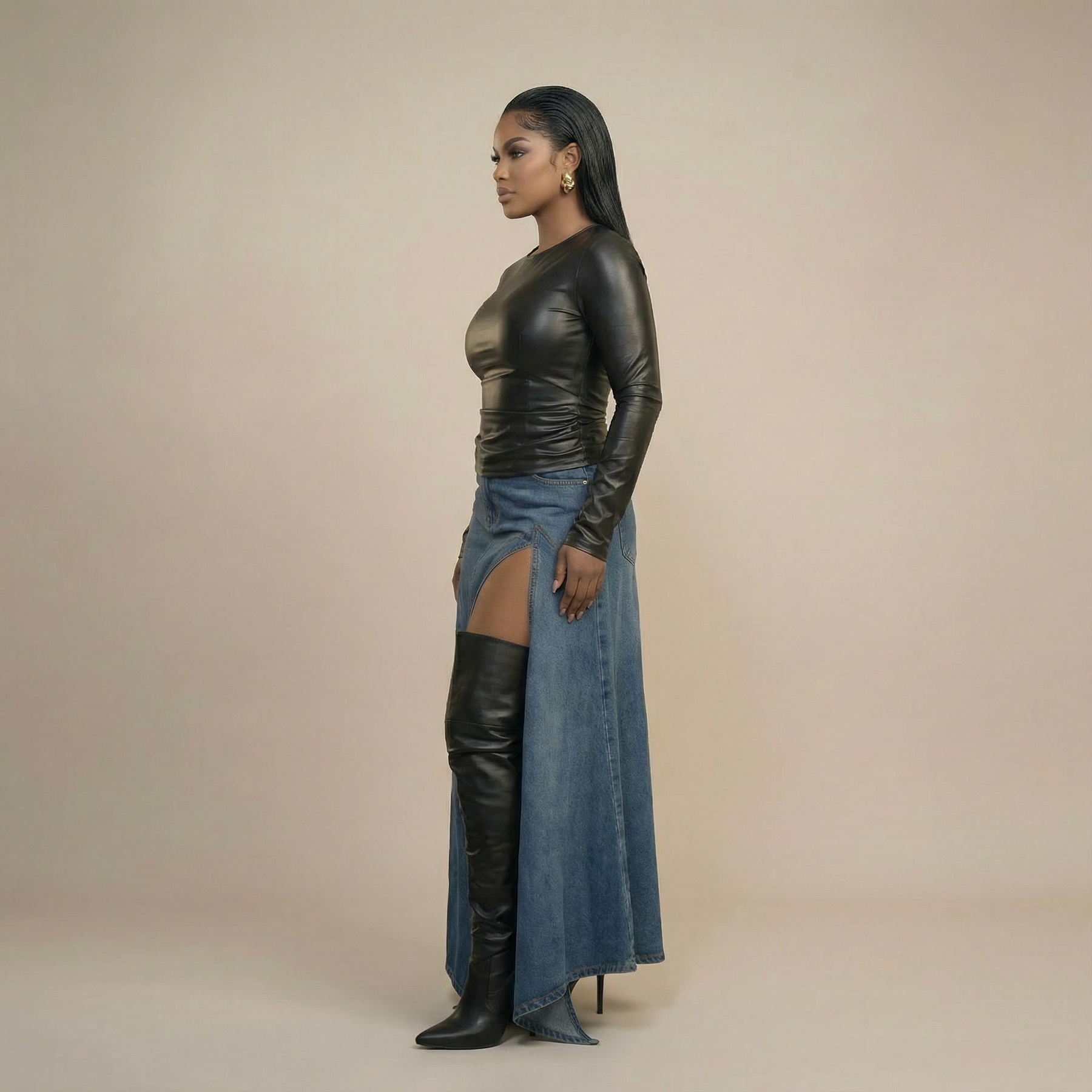Elevate your denim collection with this luxury deconstructed maxi skirt, where high-fashion design meets everyday versatility. The sculptural asymmetric hemline and dramatic front cut-out slit create a runway-inspired silhouette that commands attention, while premium structured denim ensures a refined, polished look. The elongated maxi length flatters the frame with modern sophistication, making it an essential piece for discerning style enthusiasts. Layer it with bodysuits, blazers, or leather tops for seamless day-to-night transitions that showcase your fashion-forward sensibility.